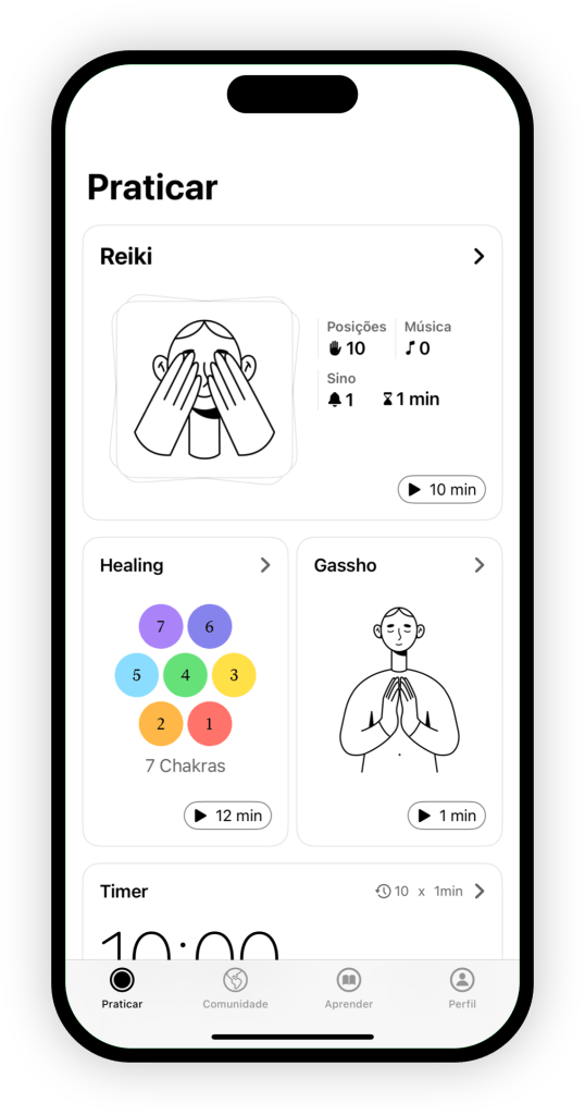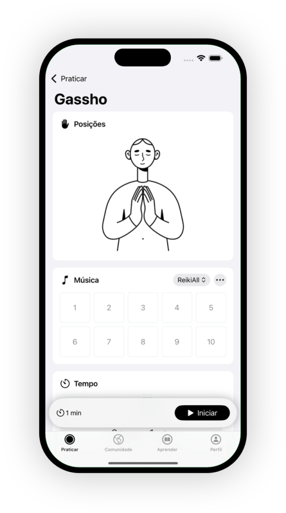 No app ReikiAll, você encontra uma sessão dedicada à meditação Gassho. Ela é simples de usar e ideal tanto para iniciantes quanto para praticantes mais experientes.